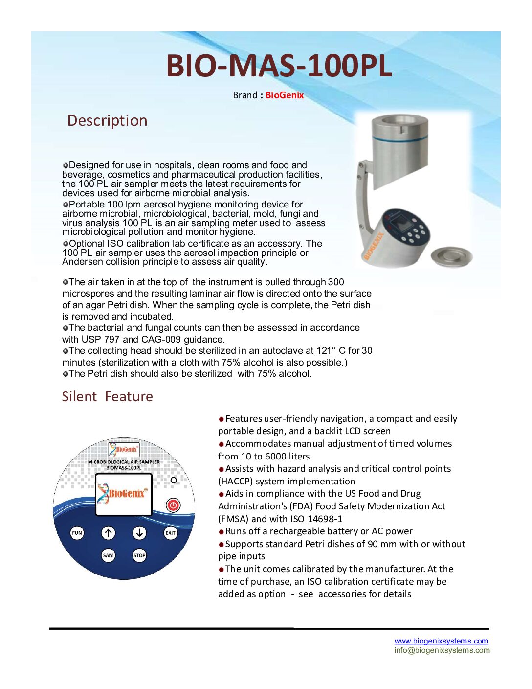 Optional ISO calibration lab certificate as an accessory. The 100 PL air sampler uses the aerosol impaction principle or Andersen collision principle to assess air quality.  The air taken in at the top of the instrument is pulled through 300 micropores and the resulting laminar air flow is directed onto the surface of an agar petri dish.  When the sampling cycle is complete, the petri dish is removed and incubated.  The bacterial and fungal counts can then be assessed in accordance with USP 797 and CAG-009 guidance. The collecting head should be sterilized in an autoclave at 121° C for 30 minutes (sterilization with a cloth with 75% alcohol is also possible.)  The petri dish should also be sterilized with 75% alcohol.