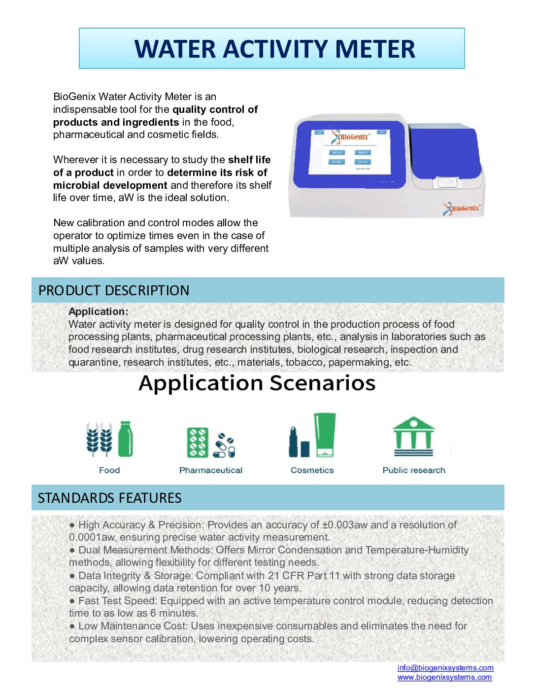 BioGenix Water Activity Meter is an indispensable tool for the quality control of products and ingredients in the food, pharmaceutical and cosmetic fields.